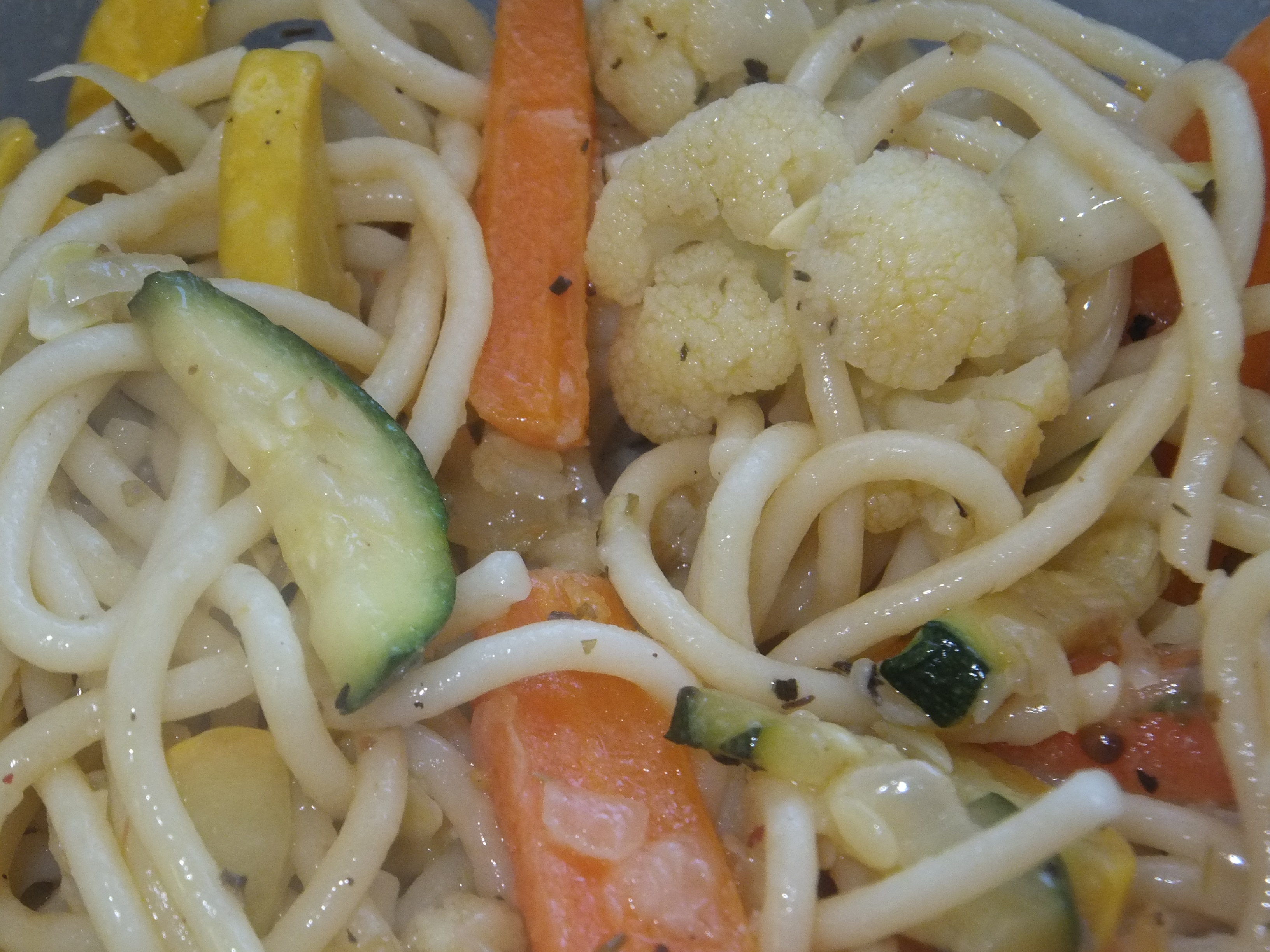 2. Heat the olive oil in a large wok or saucepan over medium to high heat. Add the onions and fresh garlic along with the cauliflower and carrots. Cook for 4-5 minutes.  Add the butter and the zucchini and squash. Cook for another 4-5 minutes or until vegetables begin to soften.